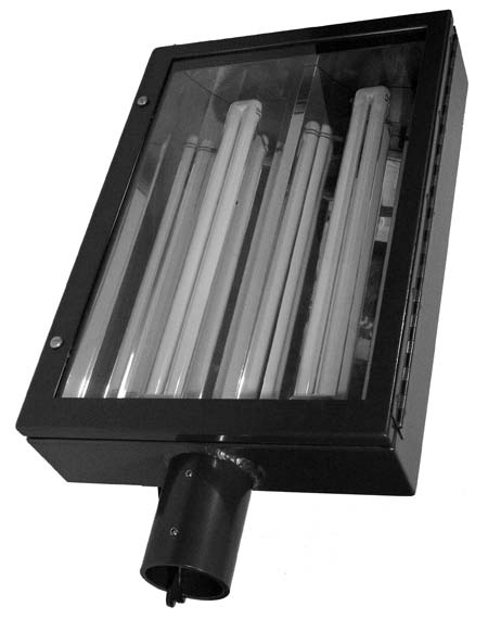 The DLS outdoor light fixture is designed for floodllighting large areas, for use with either low pressure sodium (LPS) or flourescent lamps. Flourescent is what comes standard, however LPS lamps can be ordered specially. This aluminum fixture body is powder coated dark bronze and includes captive screw hinged door with gasket and clear polycarbonate unbreakable lens. Welded rear collar set screw fitting for 2" pipe attachment. It has a multi-faceted polished-parabolic aluminum reflector which enables enhanced light output over a 2500 square ft area. Fixture is designed for remote ballast(s) and includes 30ft output cable with strain relief fitting. DC Ballast is sold seperately.