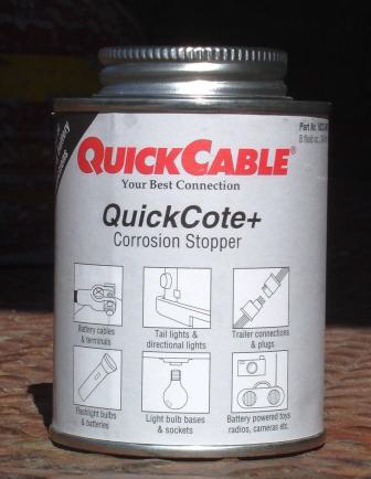 QuickCote+ Protective compound for battery terminals and connections. Special Formula seals terminals and connections against corrosion, moisture, dirt and oil. Brush on application stays put, won't drip of evaporate. Use on all exposed electrical terminals and connections. Also prevents seizing of fasteners. 8 Ounce Can with Applicator Brush, will coat one HuP Solar One 12 volt battery, for 24 volt order two cans and for 48 volt three cans will do fine.