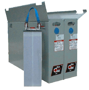 This photo at left shows a 24 volt SO-6-85-17/24 HuP Solar-One. Notice how one of the 12 cells has been removed from the epoxy coated steel container. The cell lifting strap shown is provided with the battery along with an owners manual, a 10 year maintenance logbook.